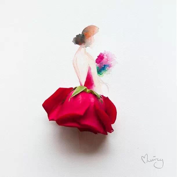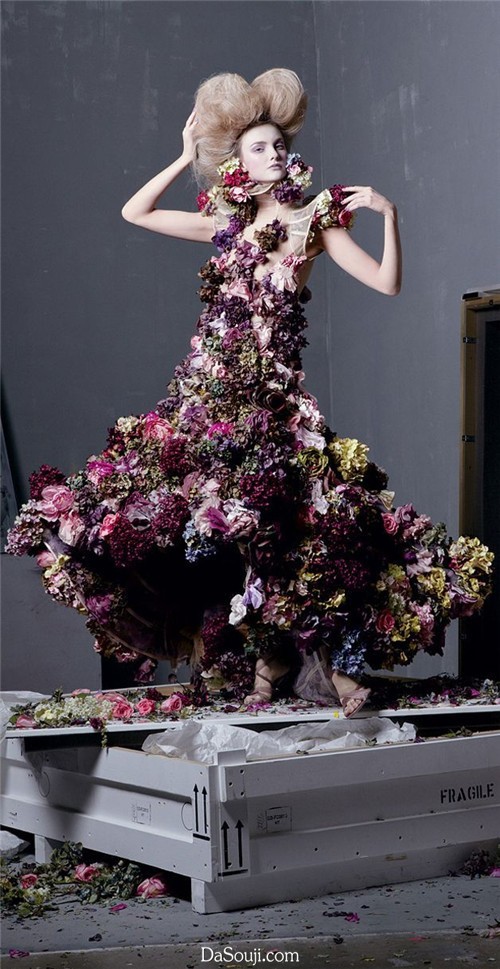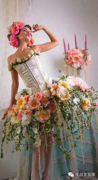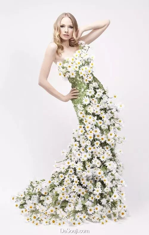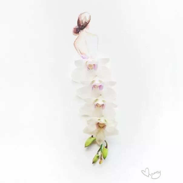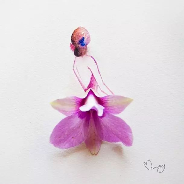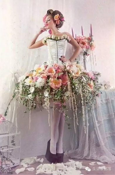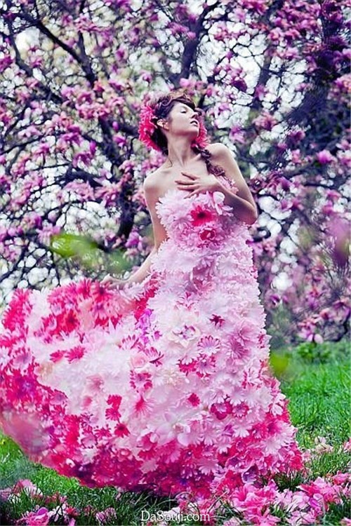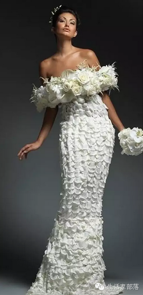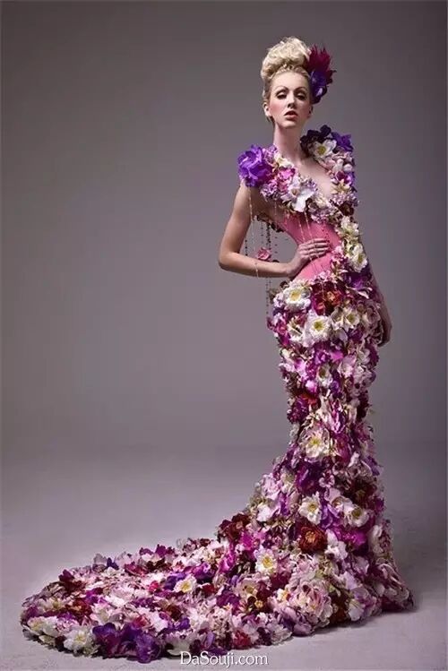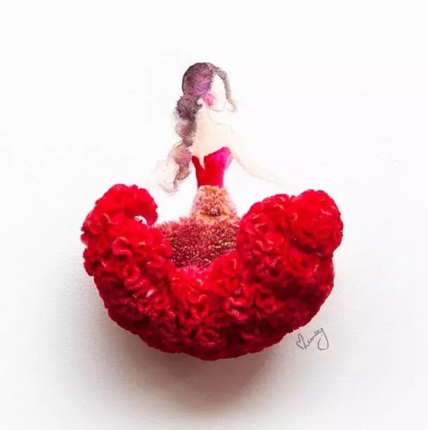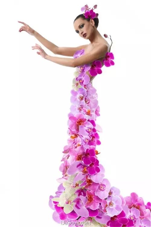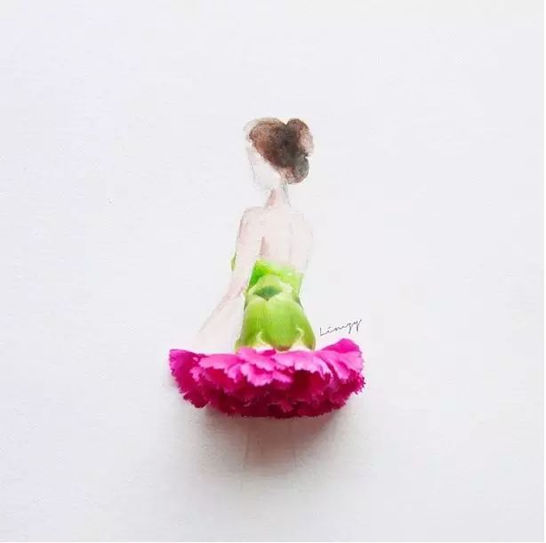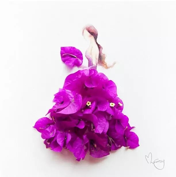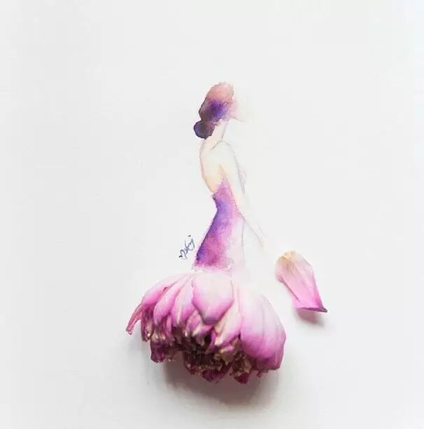 以上裙裝的設計師不詳,下面,是馬來西亞藝術家Limzy的作品,她將水彩和花瓣相結合,用一系列花朵做裙子,同樣以美聞名世界。