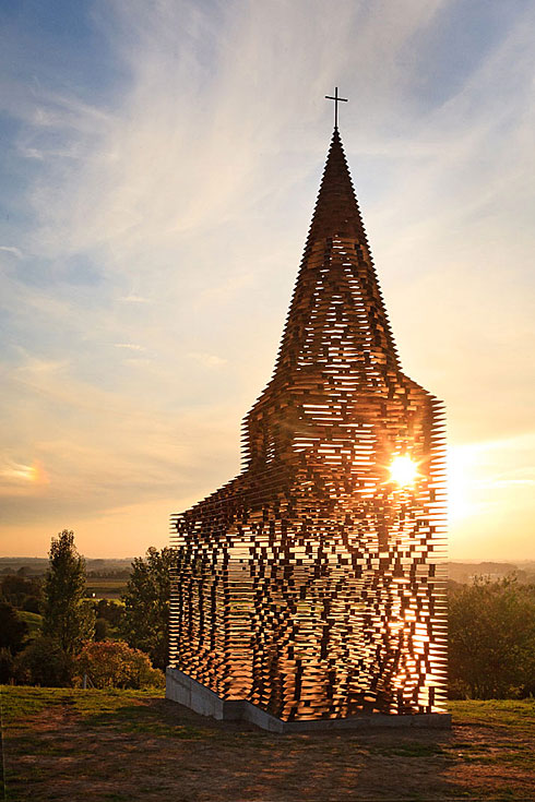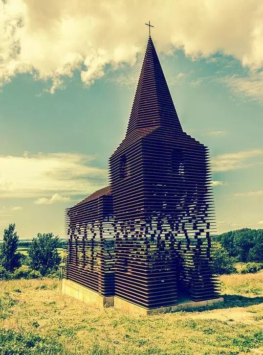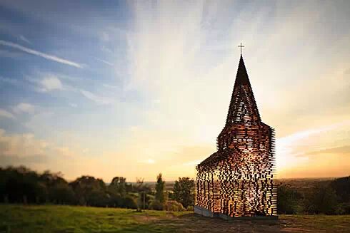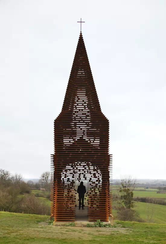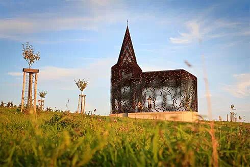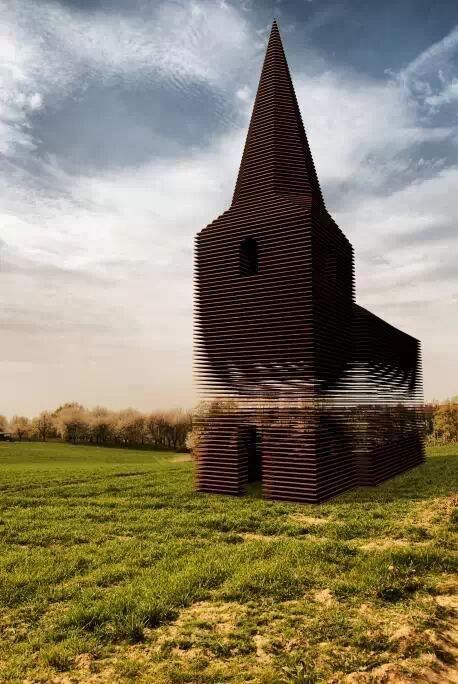 它由設計師Gijs Van Vaerenbergh 設計完成,該教堂高約10米,利用大量鋼板堆疊而成,牆面斑駁通透,創造出一種極為玄幻的光影效果。