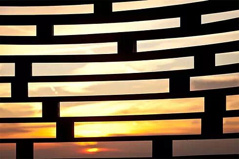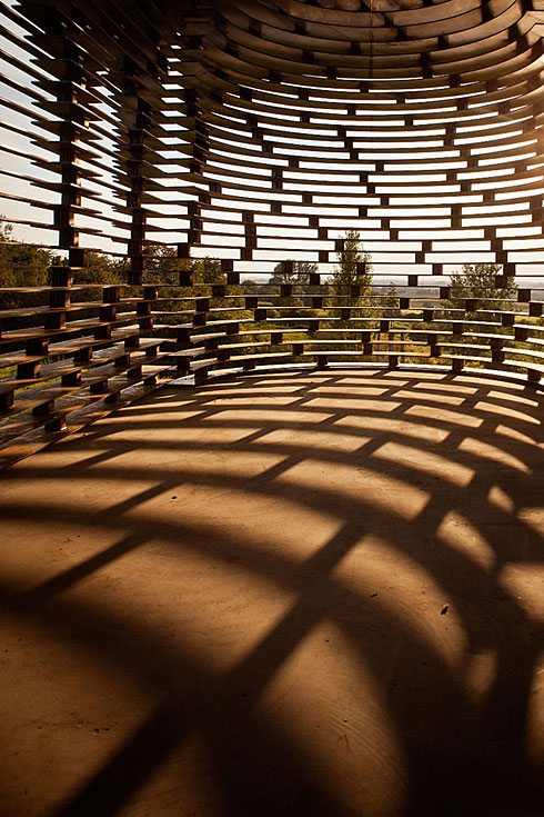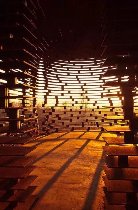 設計師用30噸鋼材,2000塊鋼片搭建成了這座教堂,教堂從外面欣賞,由於鏤空的原因,使之很好的與周圍景色融為一體,並且紅鏽的顏色也可以給冬日的場地帶來一道風景;一塊去旅行微信:TravelTV。從內部欣賞,外面的景色由於教堂每行的鋼板遮擋,從而重新詮釋了場地周邊的景色。
