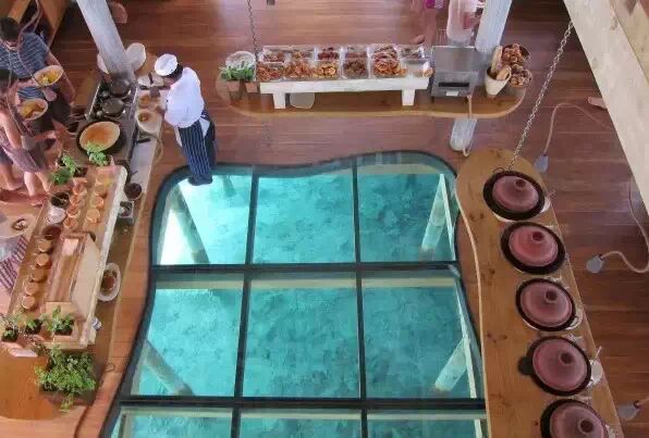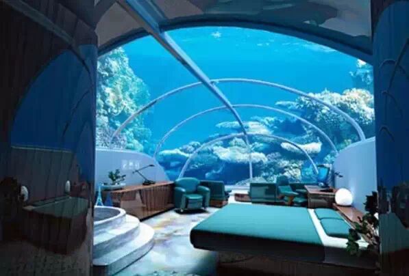 酒店有四套可以看見海底世界的豪華套房,一整面牆都是水族箱式的玻璃,無論是躺在床上還是坐在餐桌邊,旖旎的海底風光都一覽無遺。