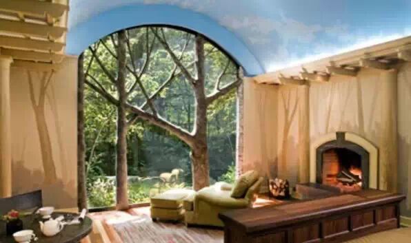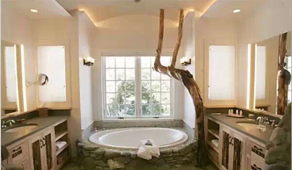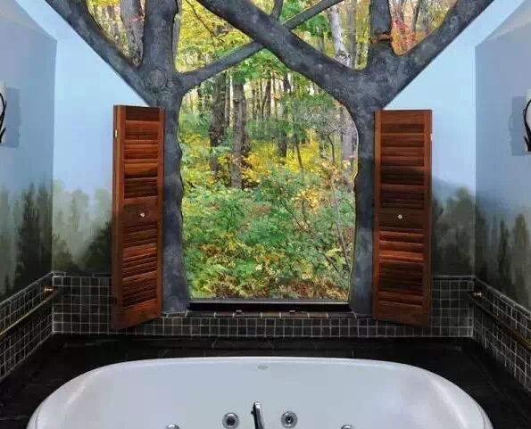 在這間浴室裡,下沉式按摩浴缸安裝在地台上,陽光通過窗口照進來,窗框設計成樹枝的形狀——用起來更為舒適,感覺就像是在露營地沐浴。