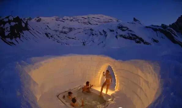 除了 冰教堂、冰電影院、冰客房、冰酒吧,更有冰雪環繞的露天溫泉,在極寒的瑞典,這就算住客們極致享受的溫暖“浴室”了吧~