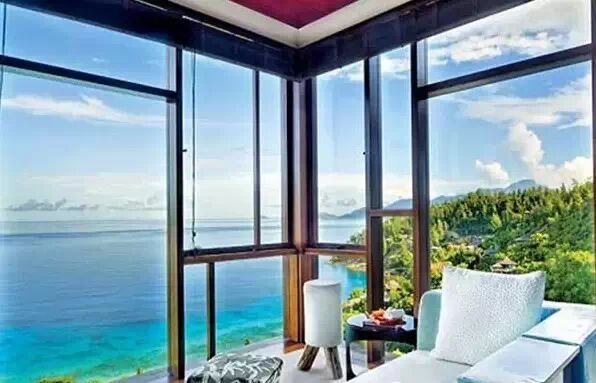 巨大的落地窗,讓濤聲和海浪都引入房間,一片蔚藍。