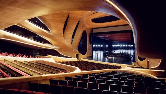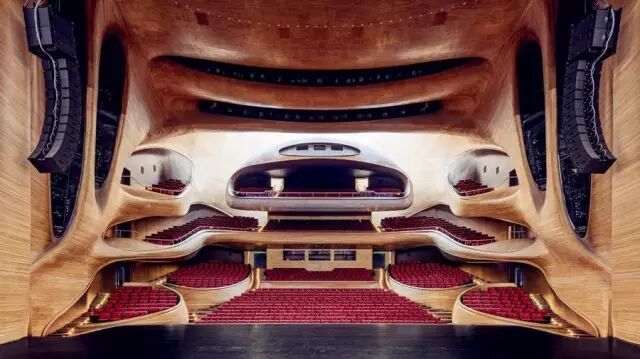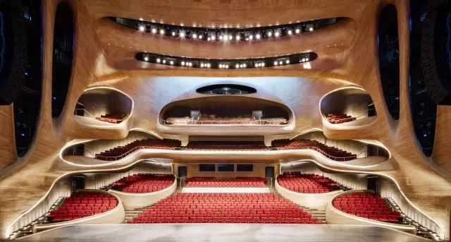 溫暖的水曲柳木材做成環繞大劇場室內外的曲面牆體,以簡單材料和精妙空間實現了世界級的聲學效果。精心設計的照明效果,引導觀眾自然而然的進入接下來的藝術表演世界中。