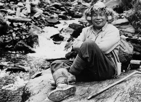 1950年代,頭戴斗笠的蔣經國,巡視中部橫貫公路的施工情形,休息時露出愉悅的笑容。中橫公路西起台中縣谷關,東到花蓮太魯閣,沿途峭壁參天,景色威壯。開拓這條公路具有一定的難度,開路工人是所謂“榮民”,即戰火間退役的老兵。