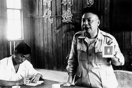 蔣經國手持“中國青年反共救國團”的隊徽,正對乾部進行講話。1952年,蔣經國催生“救國團”,擔任救國團主任,1973年方卸下主任一職。期間他被稱作“青年的導師”,頗受青年學生的歡迎。
