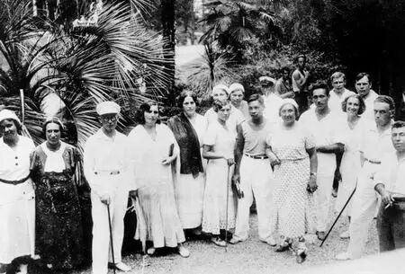 1920年代,宋美齡和丈夫、母親等家人合影。前排右一是大姊宋靄齡,中間是宋母倪桂珍。後排右一是弟弟宋子安,右二是大姊夫孔祥熙,左一是弟弟宋子良。宋家另有次女宋慶齡和長子宋子文。