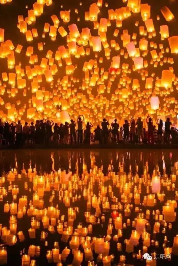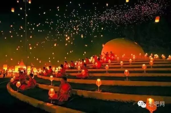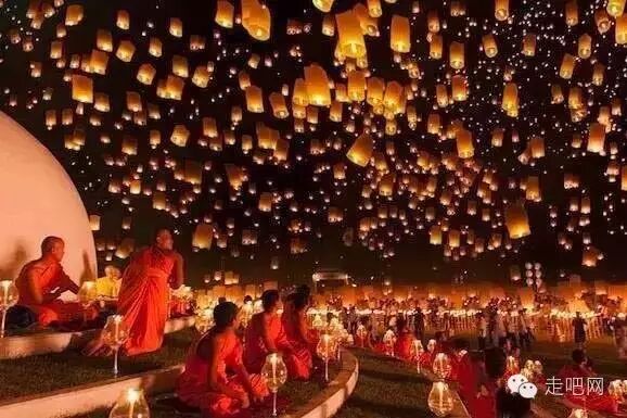 每年這天晚上,都有上萬隻天燈帶著人們的心願,飛上天空,僧侶也會在一旁祈福巡燭。