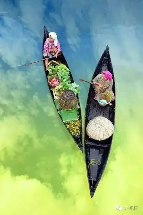 這裡是不可多見的水上集市,攤販們劃著小木船在窄小的河上慢慢行駛著,交錯往來。