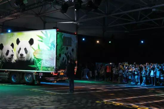 公交车顶上也爬满了熊猫。憨憨的样子,向路人们发出信号“来不及了,快上车”。