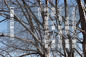 人生沒有恆久不變的——老病難免、富貴不久長、際遇有波折。無欲、不貪,心寬念純,無常中也能歡喜自在。