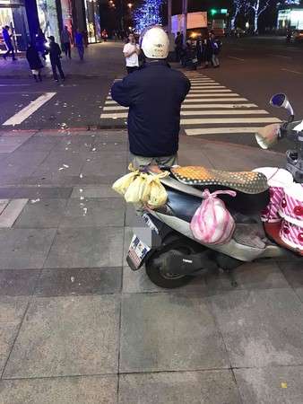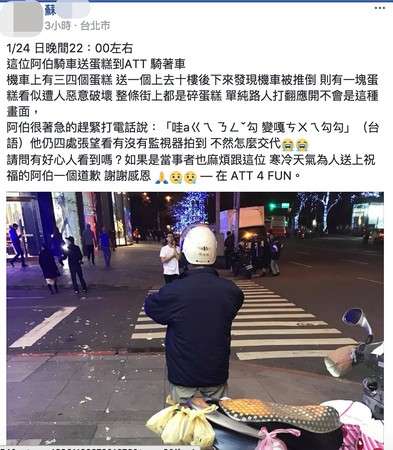 ▼一位蘇姓網友在臉書社團貼文表示,阿伯晚間十點到ATT 4 FUN送蛋糕,車上本來有3、4個蛋糕,但他拿一個到10樓後,下來就發現機車被推倒,滿街都是碎蛋糕和奶油渣。
