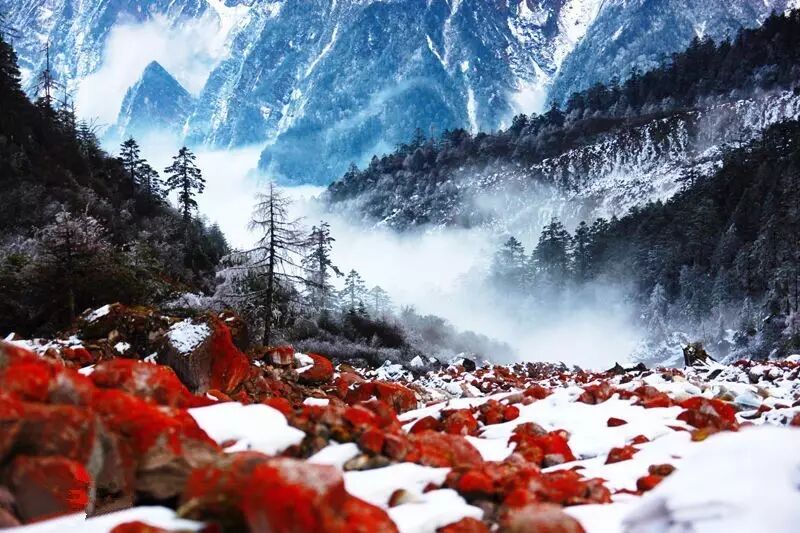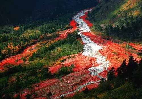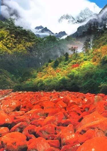 雅家梗紅石灘大概是大自然贈予貢嘎山最濃豔的風景了。這裡是中國最大的紅石公園,漫山遍野的紅石頭,比女孩們嘴上的任何一色口紅都要嬌豔。