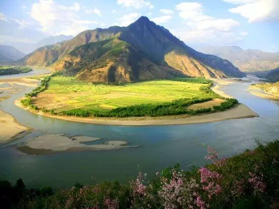 穿山越谷而來的金沙江,水勢浩蕩,卻在即將衝出川滇要塞之時,突然來了個“急剎車”,圍繞著金字塔般的日錐峰瀟灑地畫了一個“Ω”字形的大拐彎,成就了這一處奇景。