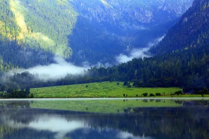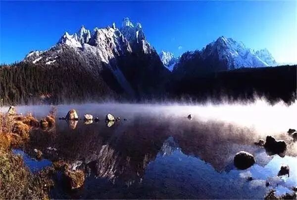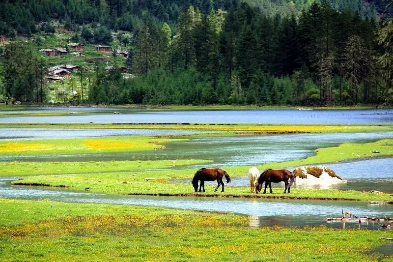 這裡的天是湛藍的,湖水是翠綠的,樹林是原始的, 縹緲的雲在山谷間纏繞,星羅棋布的碎石在水底若隱若現,湖邊的水草在風中搖曳生姿……這樣的美景,不知迷醉了多少過路者的心。
