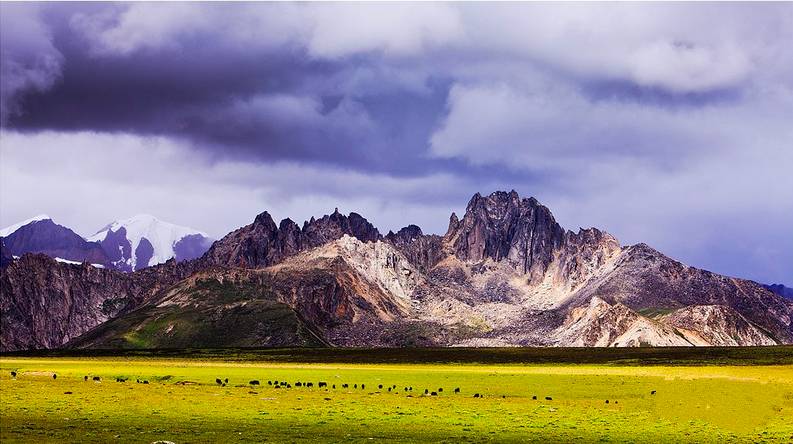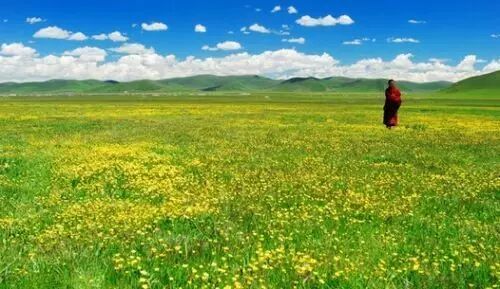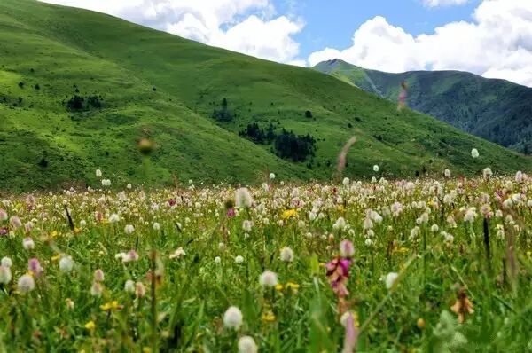 在四川,除了已颇有名气的塔公草原外,还有一个如诗如画的祝桑草原。夏日时,远处的雪山映照着宽广的祝桑草原,而五色的花朵、成群的牛羊和古老的白色民居就像画卷一般在眼前铺展。