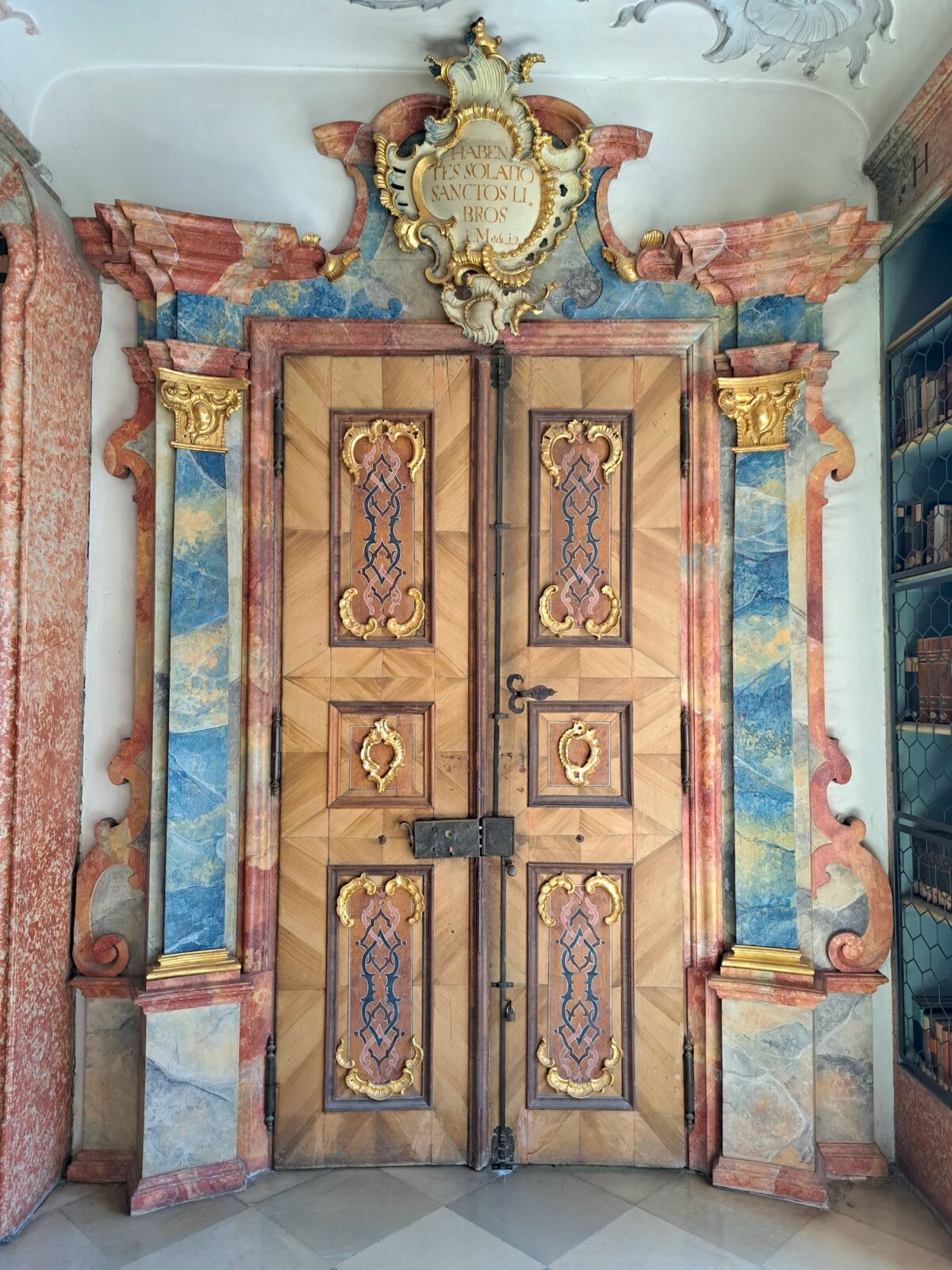 樓梯連接圖書館大廳的第一層和第二層,中央樓層由多米尼庫斯‧埃爾梅內吉爾德‧赫爾伯格(Dominikus Hermenegild Herberger)雕刻的八座彩繪木製雕像環繞,代表法理學、自然科學、數學、歷史、服從、脫離世界、信仰和祈禱。入口的上方是標誌圖書館豐富館藏的拉丁文銘文,意為:智慧和科學的所有寶藏。