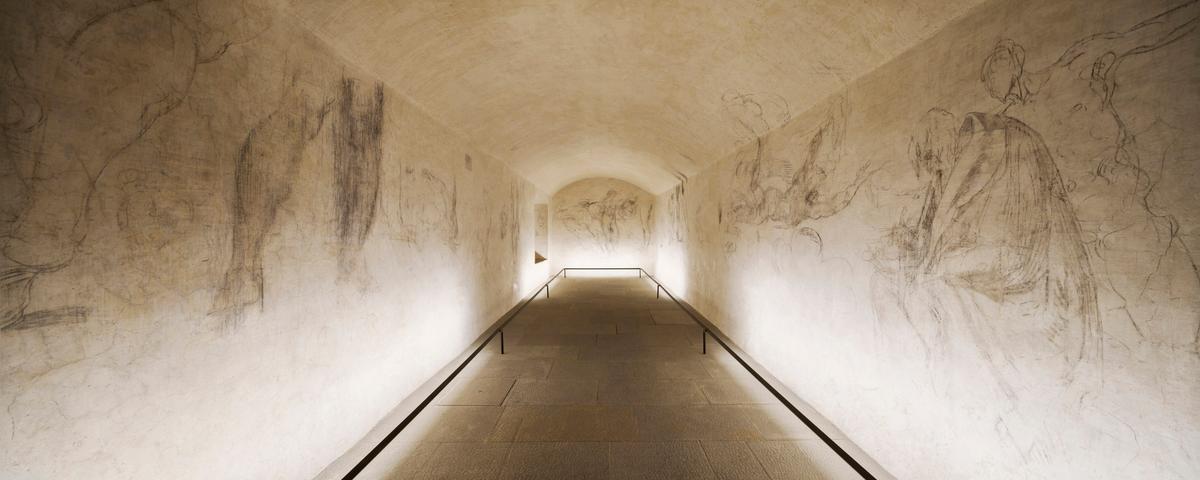 米開朗基羅的密室隱藏了很長一段時間。直到1975年,在清潔過程中對牆壁進行測試時,才被發現。在兩層石膏下面,修復人員在牆上發現了幾個用木炭和血紅色顏料畫的人物。這些畫作的大小各不相同,有些畫作重疊。