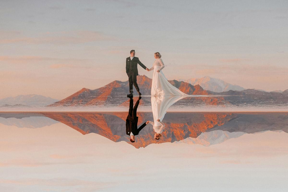 在李莉的照片中,一隻加拿大松鴉(Canada jay),也叫威士忌傑克鳥(whiskey jack),正好落在美麗新娘的頭上。米凱拉(Mikaela)站在她的新郎米奇(Mitch)對面,雙手緊握,嘴巴張得大大的,對這位不速之客感到震驚和高興。歡樂的時刻與背景中加拿大山脈的廣闊、變幻的雲層形成鮮明對比。