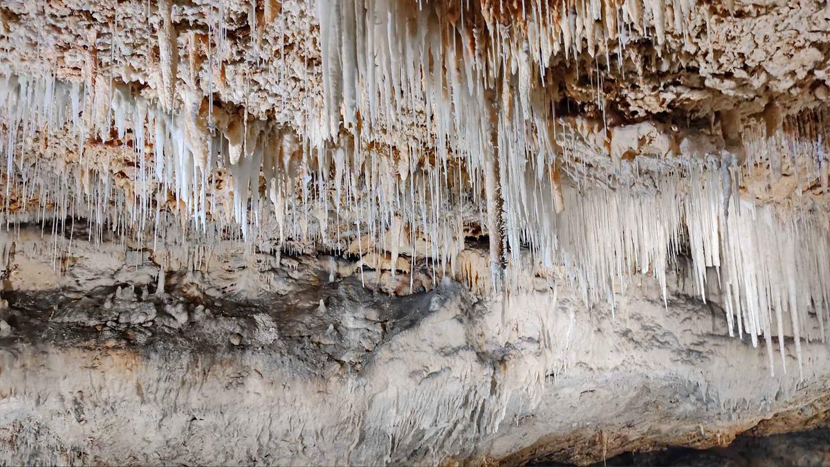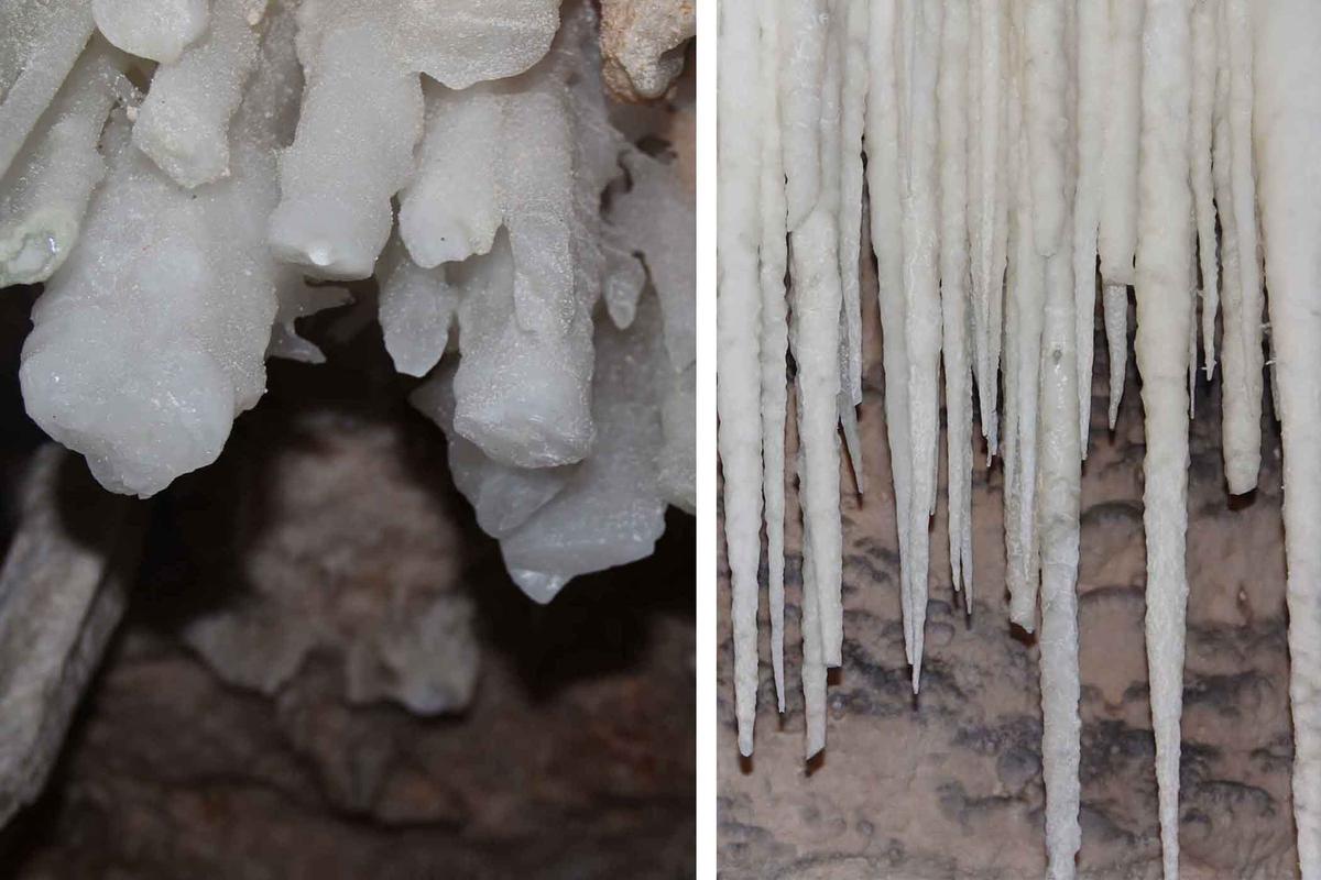 從家裡拿來一盞煤油燈後,他們潛入更深處,目睹了大自然母親的輝煌傑作:無數大小不一的純白色水晶鐘乳石從洞穴天花板上垂下。聽著水波的聲音,他們明白了,遠處是一汪清澈的湖水,貫穿整個洞穴。