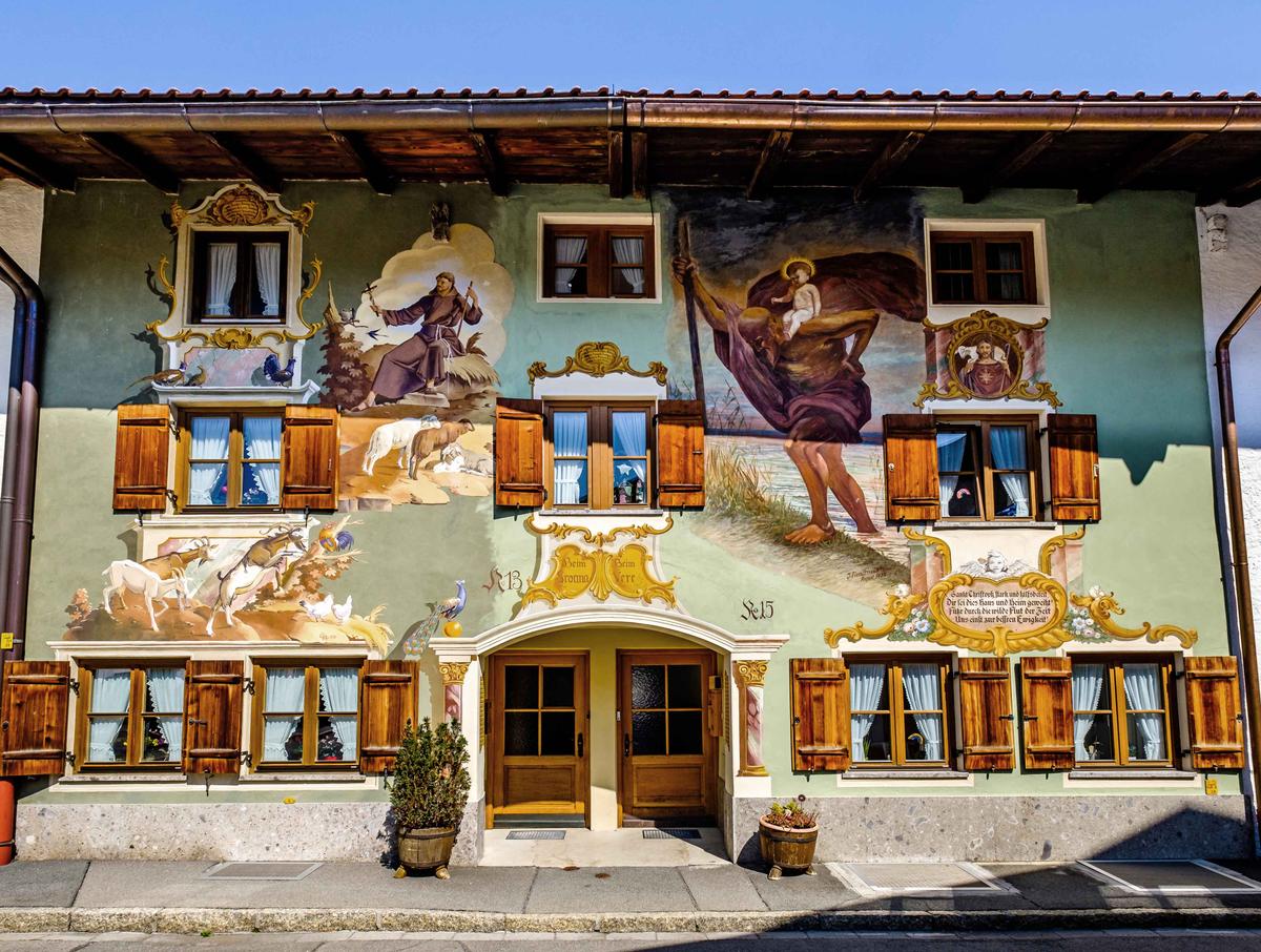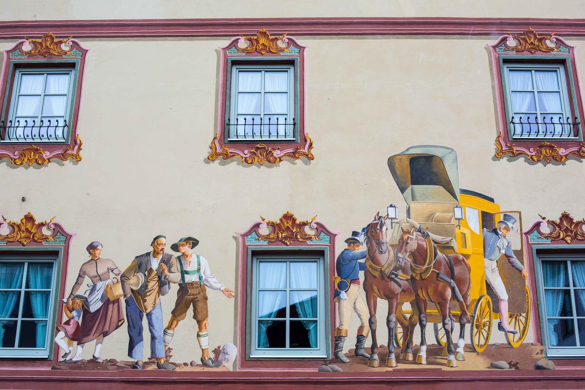 這些巴洛克風格的壁畫(lüftlmalereien)使小鎮成為一本活生生的故事書。各種小場景點綴著整個小鎮,大部分聖經主題栩栩如生。通過將透視技術與人造建築相結合,靈感十足的人物和雲朵與窗台、門框、橫梁、陽台和建築物幻覺般地融合在一起。