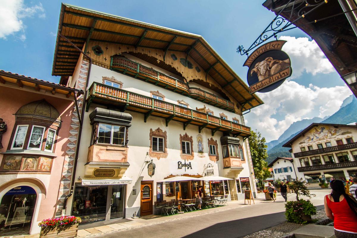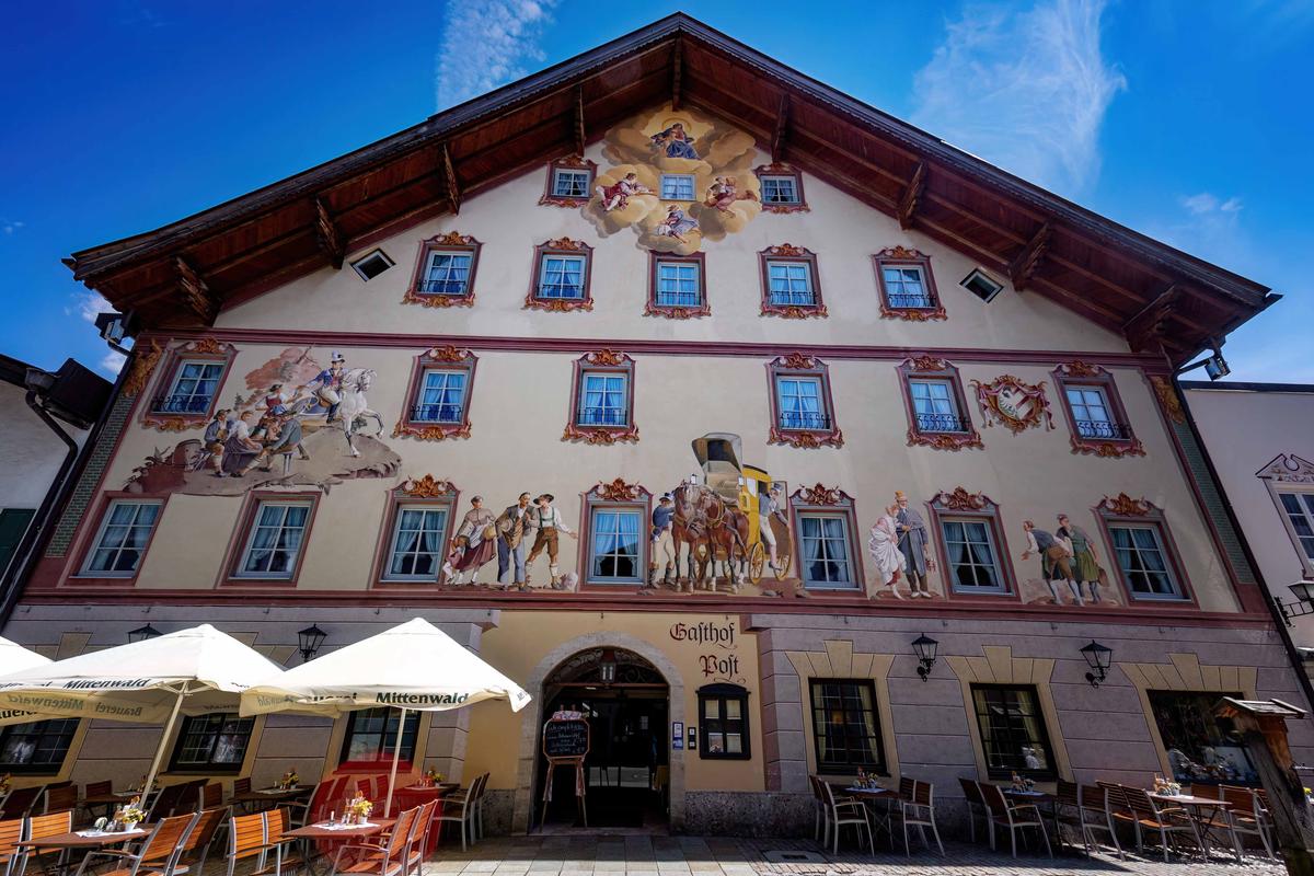 神山繚繞在米滕瓦爾德色彩繽紛、華麗的山牆上。噴泉沿著那條小鎮居民引以為豪的長廊噴涌而出,這條長廊從聖彼得和保羅教區教堂開始。人行道的盡頭是一個廣場,廣場上有一把比人還大的小提琴雕塑。