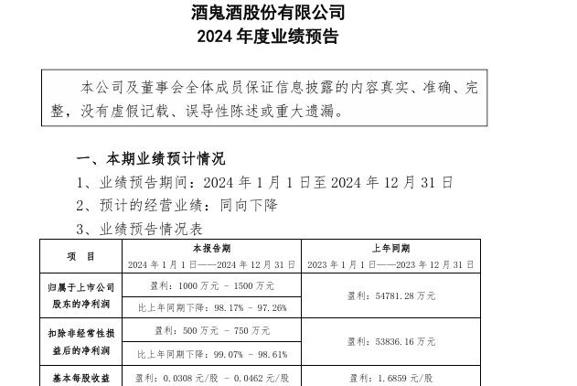 酒鬼酒預估2024年業績下滑98%。(公告截圖)