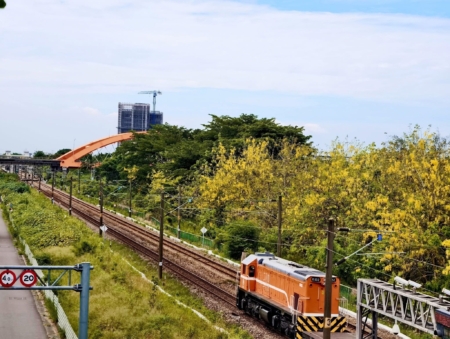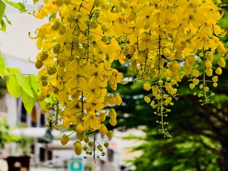 這個夏天,台南崇善路、東豐路、成大校園到十鼓文化村周邊,彷彿被一場金黃花雨輕輕覆蓋,盛放的阿勃勒如同陽光凝結的瀑布,與行駛的火車、自行車、摩托車交織成一幕幕動人的夏季風景。廖翠環用鏡頭,替這座城市寫下了溫柔的註腳。