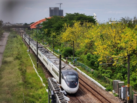 從虎山橋高處俯拍,是她最愛的構圖方式之一。她選擇在上午陽光剛灑下、花朵色澤最飽和的時刻拍攝,不只捕捉到列車本身,更與鐵道兩旁的黃金雨樹構成強烈對比。白色普悠瑪列車則宛如穿越花海的白鷺,一列列車彷彿承載不同故事,穿越綠黃交錯的時光隧道。