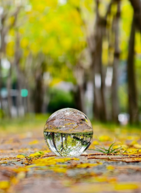 除了高空俯瞰,廖翠環也熱衷於使用創意道具,像是玻璃水晶球來拍攝街道。照片中,掉落的阿勃勒花瓣鋪滿人行道,一顆水晶球在地面上映照出顛倒的街景與黃金雨,營造出夢境般的雙重空間。