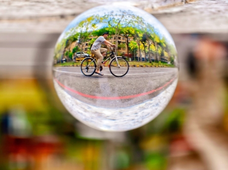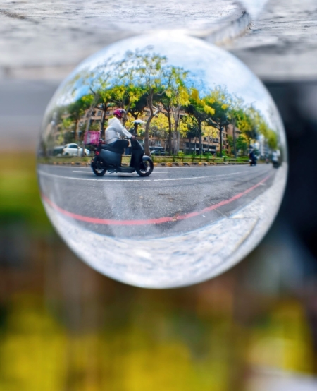 其中一張透過鏡球拍攝的單車畫面,讓人眼睛一亮。「我把鏡球架在路邊的桌子上,以斜角捕捉騎士經過那一剎那,剛好拍下整條路倒映在球體裡的對稱構圖。」她說。