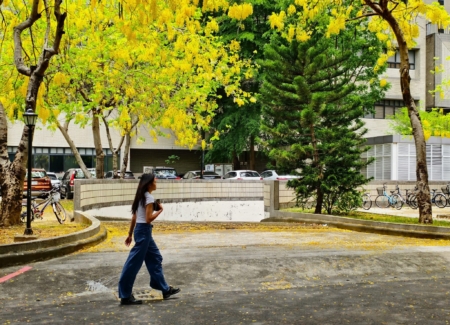 她的另一系列作品中,記錄了在成大校園裡騎腳踏車的學生,在金黃花雨下穿行的日常畫面。有人戴著耳機穿過滿地落花,有人背著包緩慢前行,畫面寧靜,彷彿時間被放慢。
