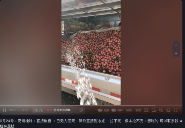 近期在中國社交媒體上流出大量視頻,荔枝種植戶或商家抱怨行情太差,許多地方的價格降到每斤不足1元(人民幣,下同)。還有果農被迫賠本拋售,喊價五毛錢三斤。