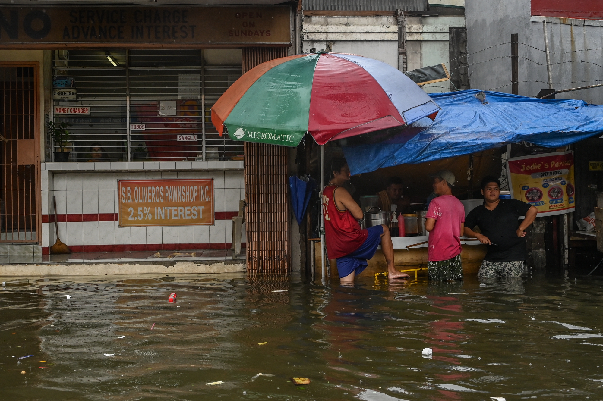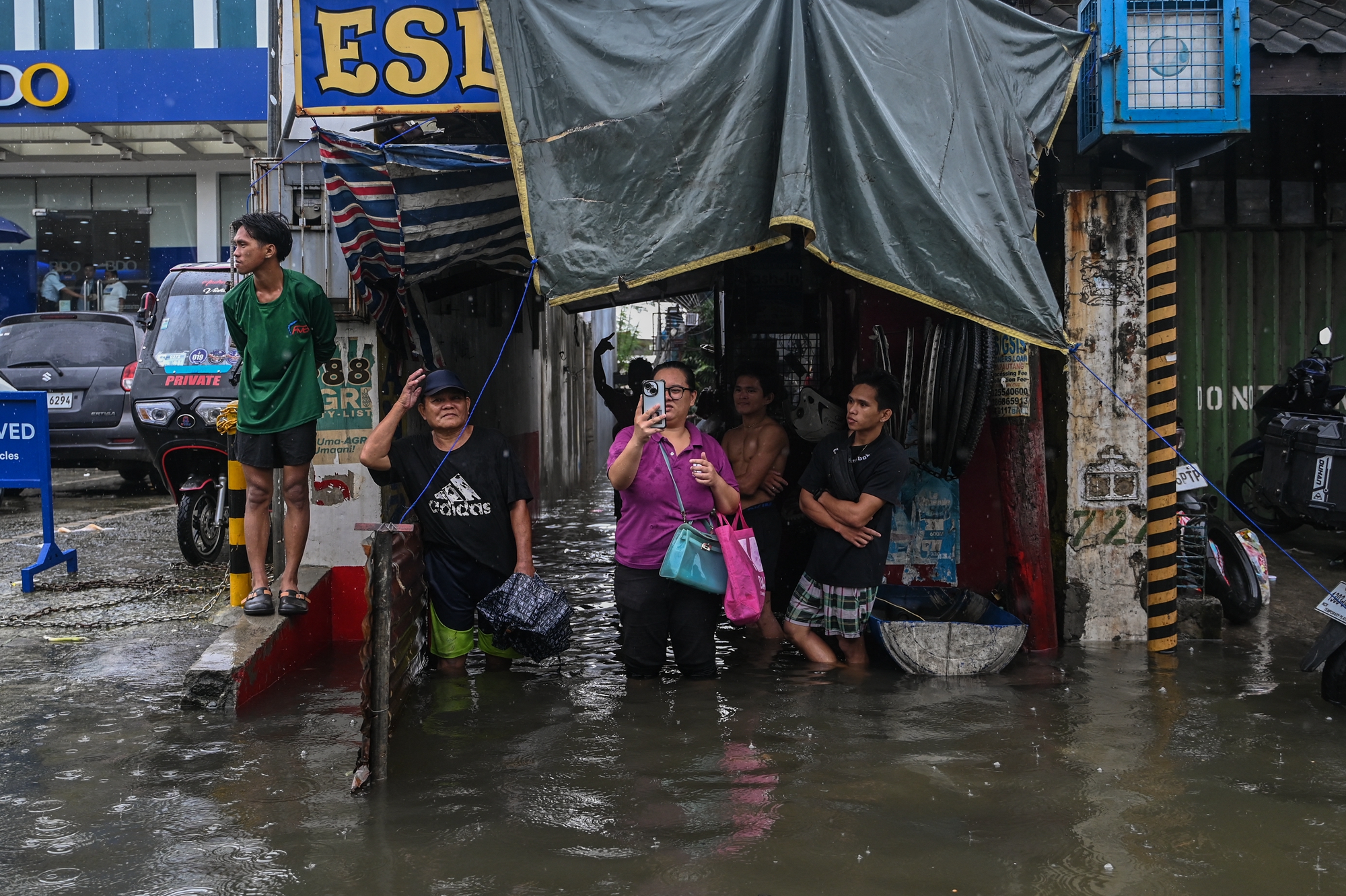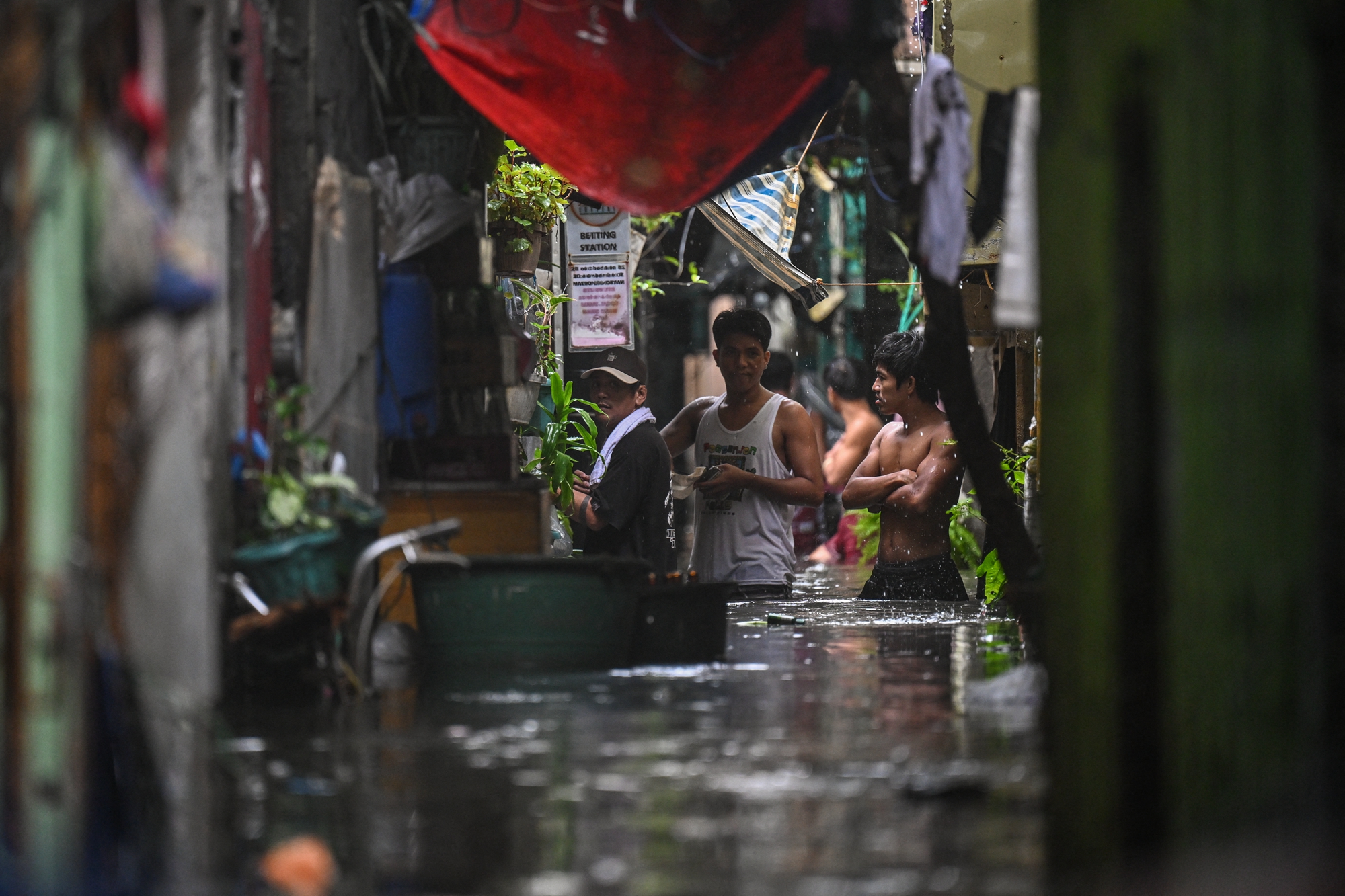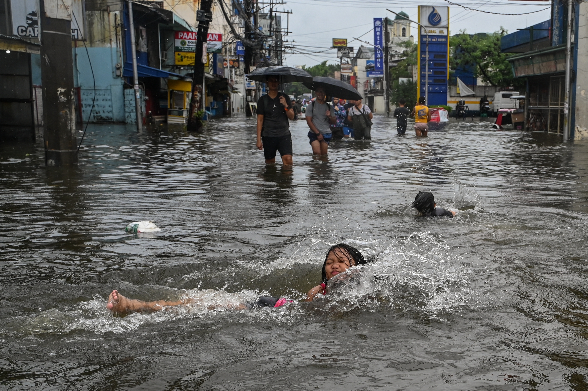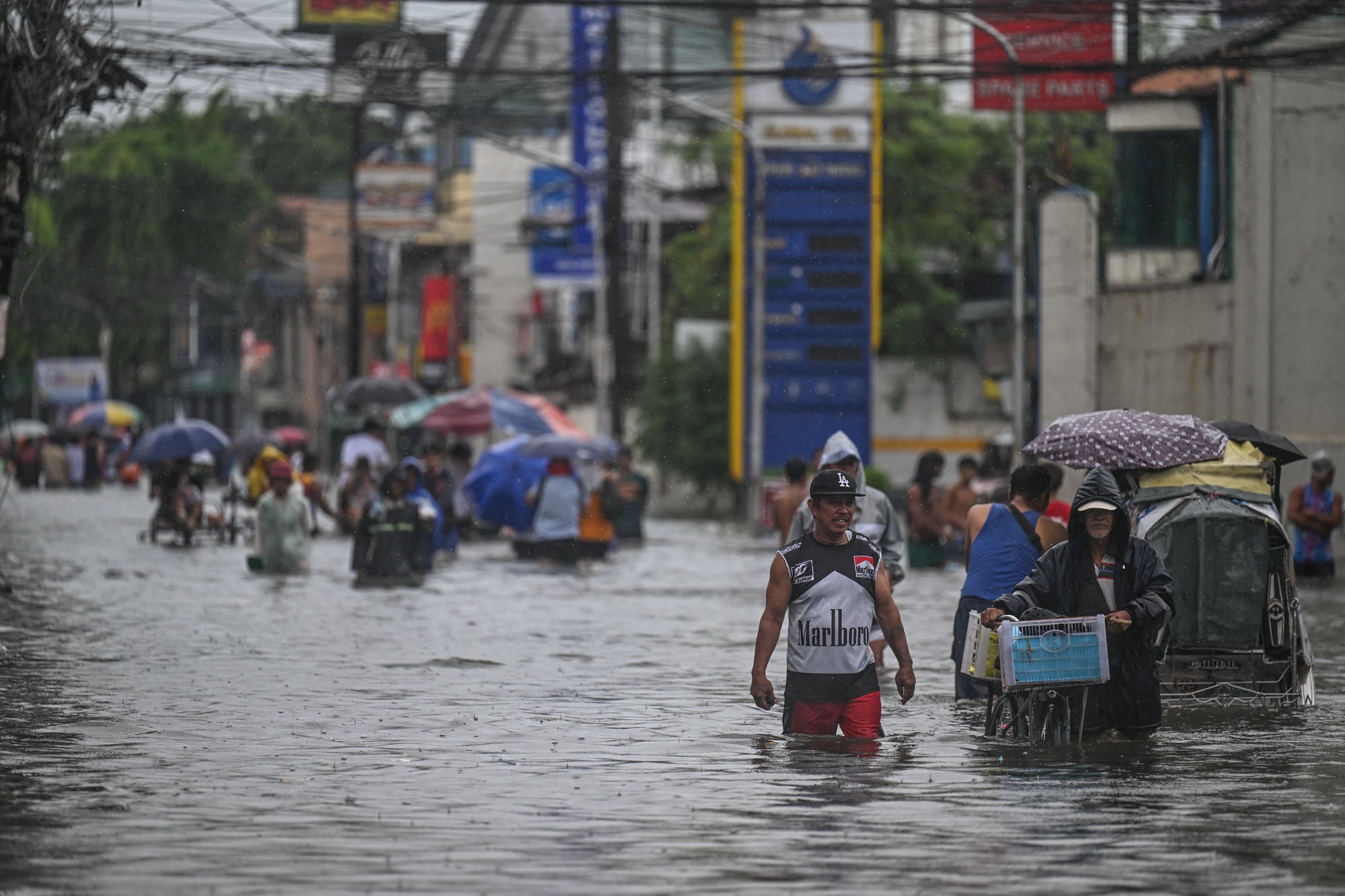 2025年7月24日,馬尼拉北部邦班詩蘭省(Pangasinan,又譯邦阿西楠省)達古潘市(Dagupan City)遭暴雨襲擊後,民眾涉水穿過被洪水淹沒的街道。(STR/AFP via Getty Images)
