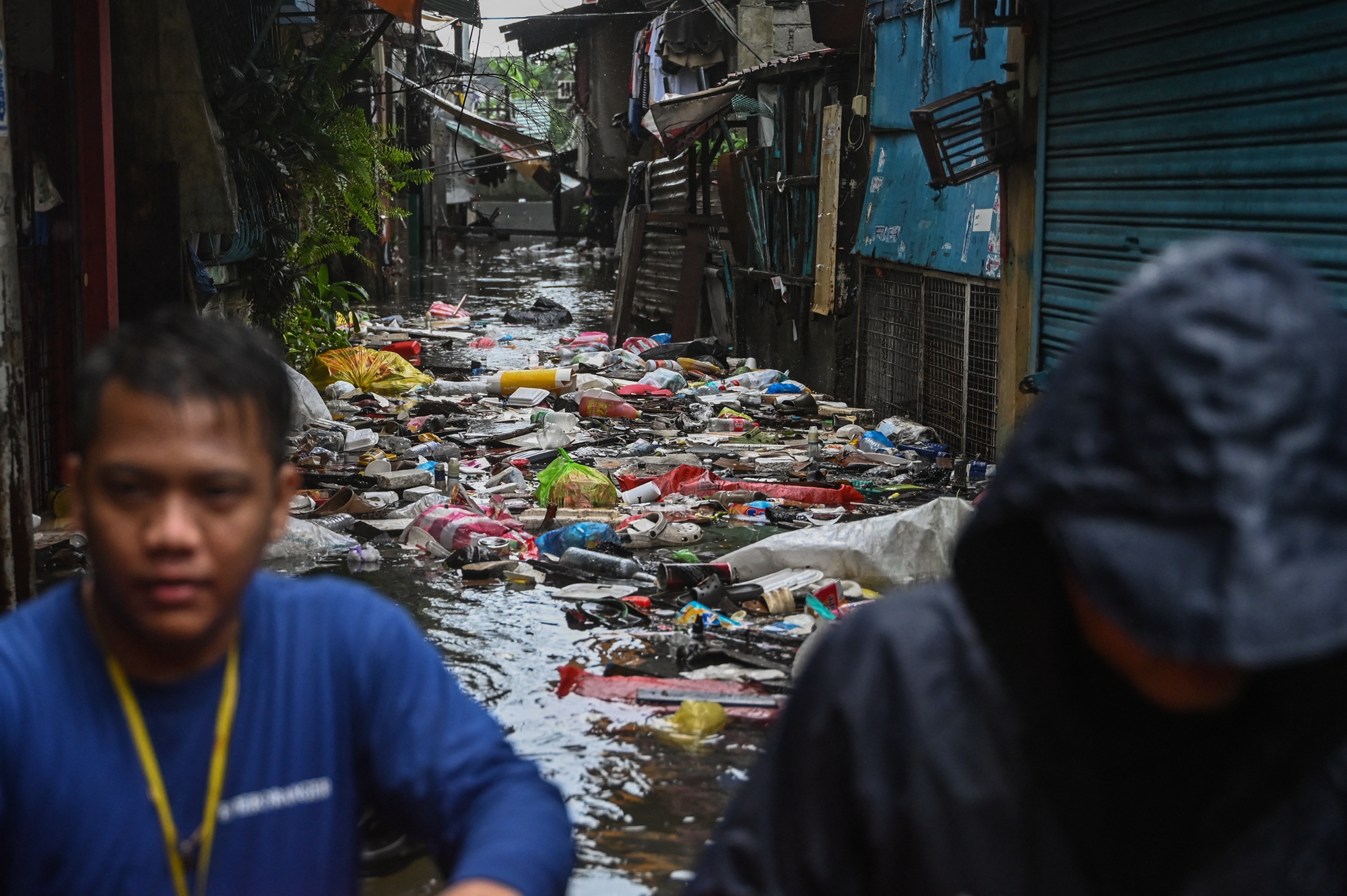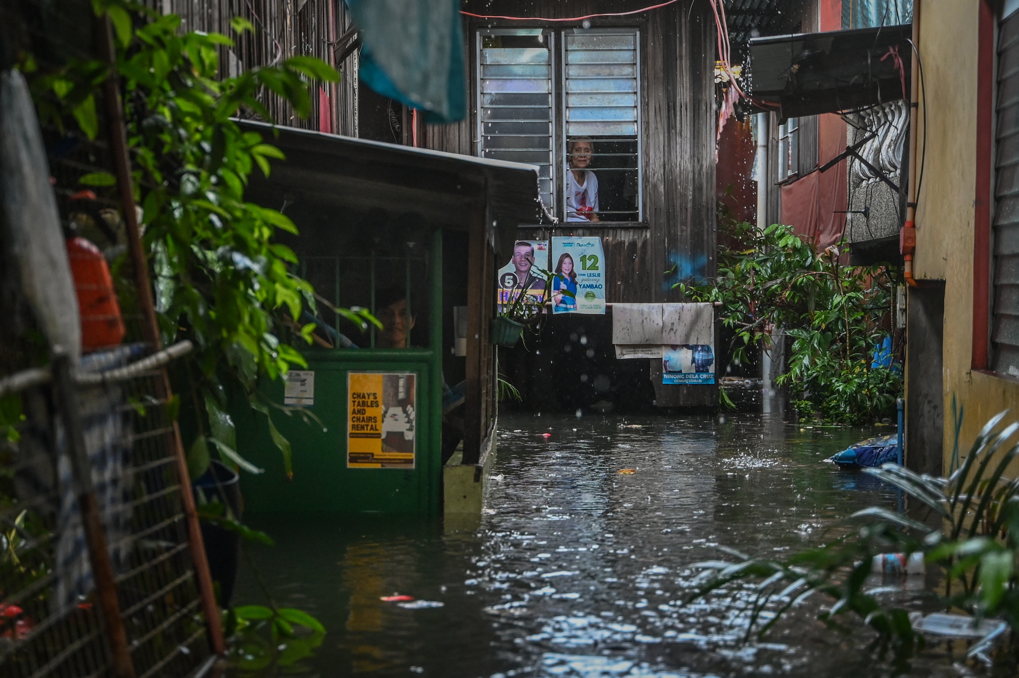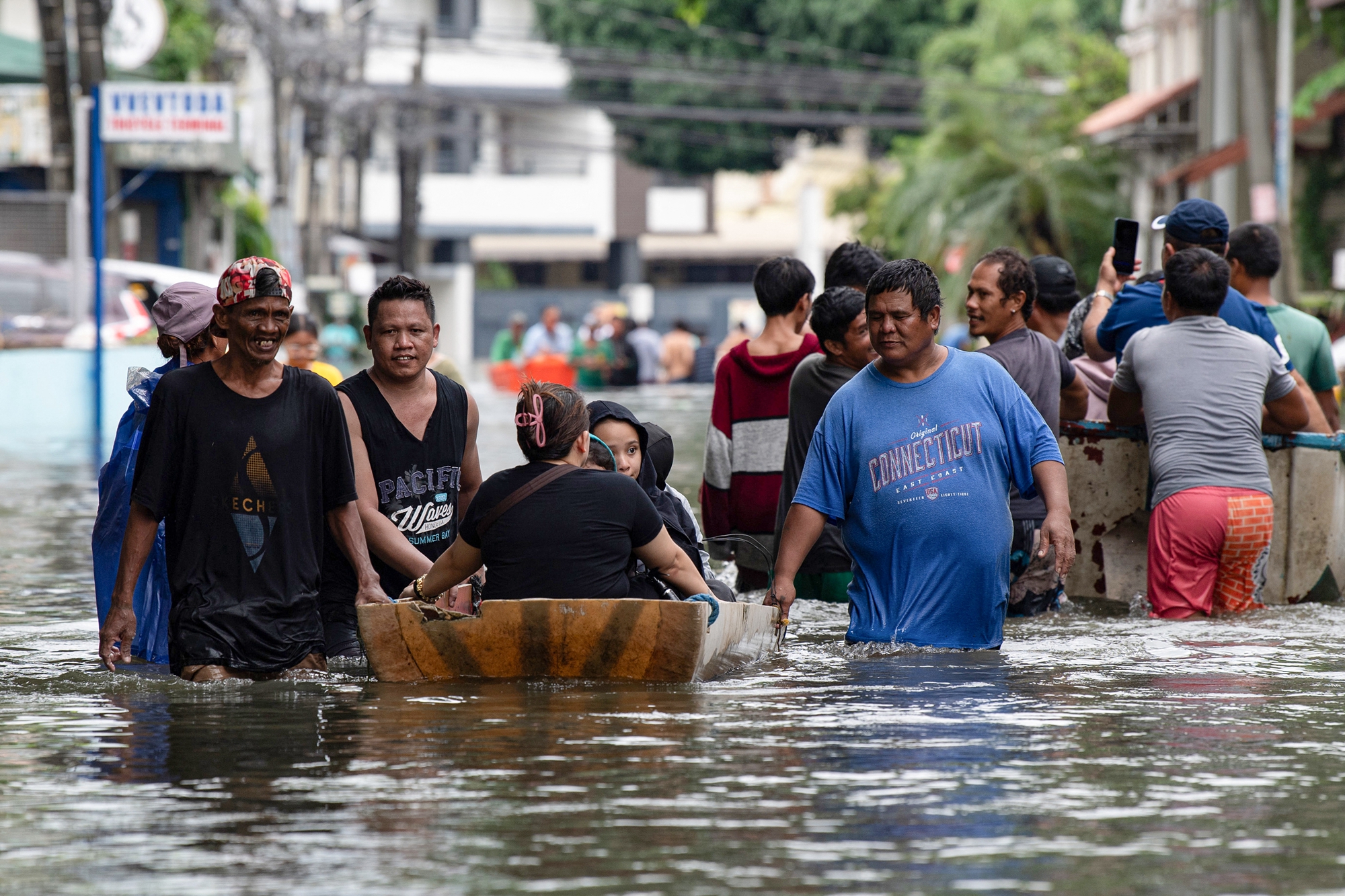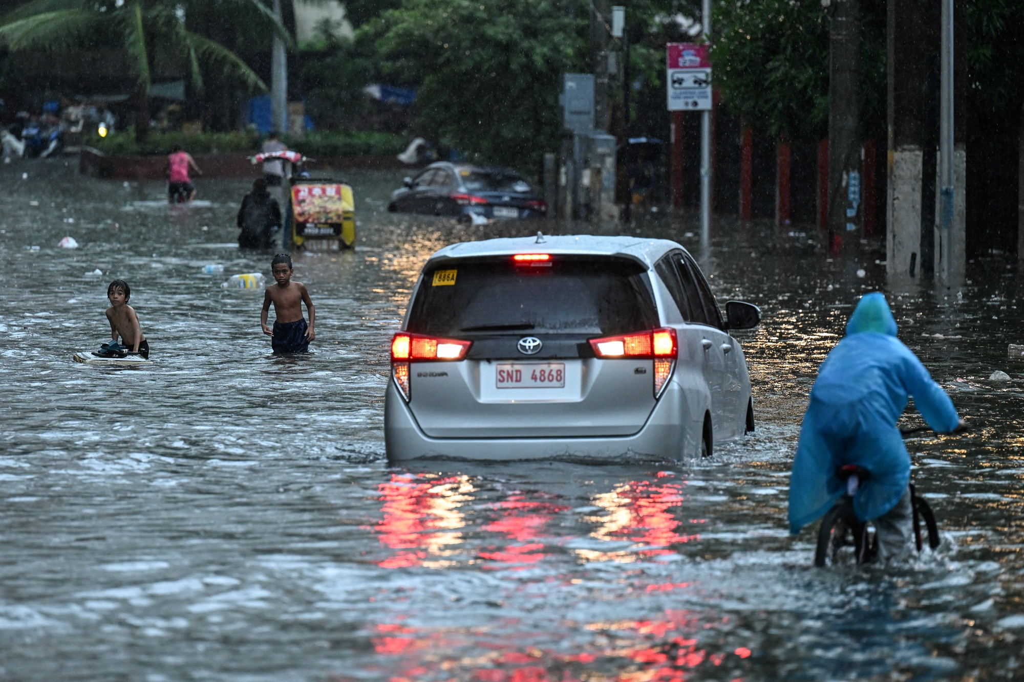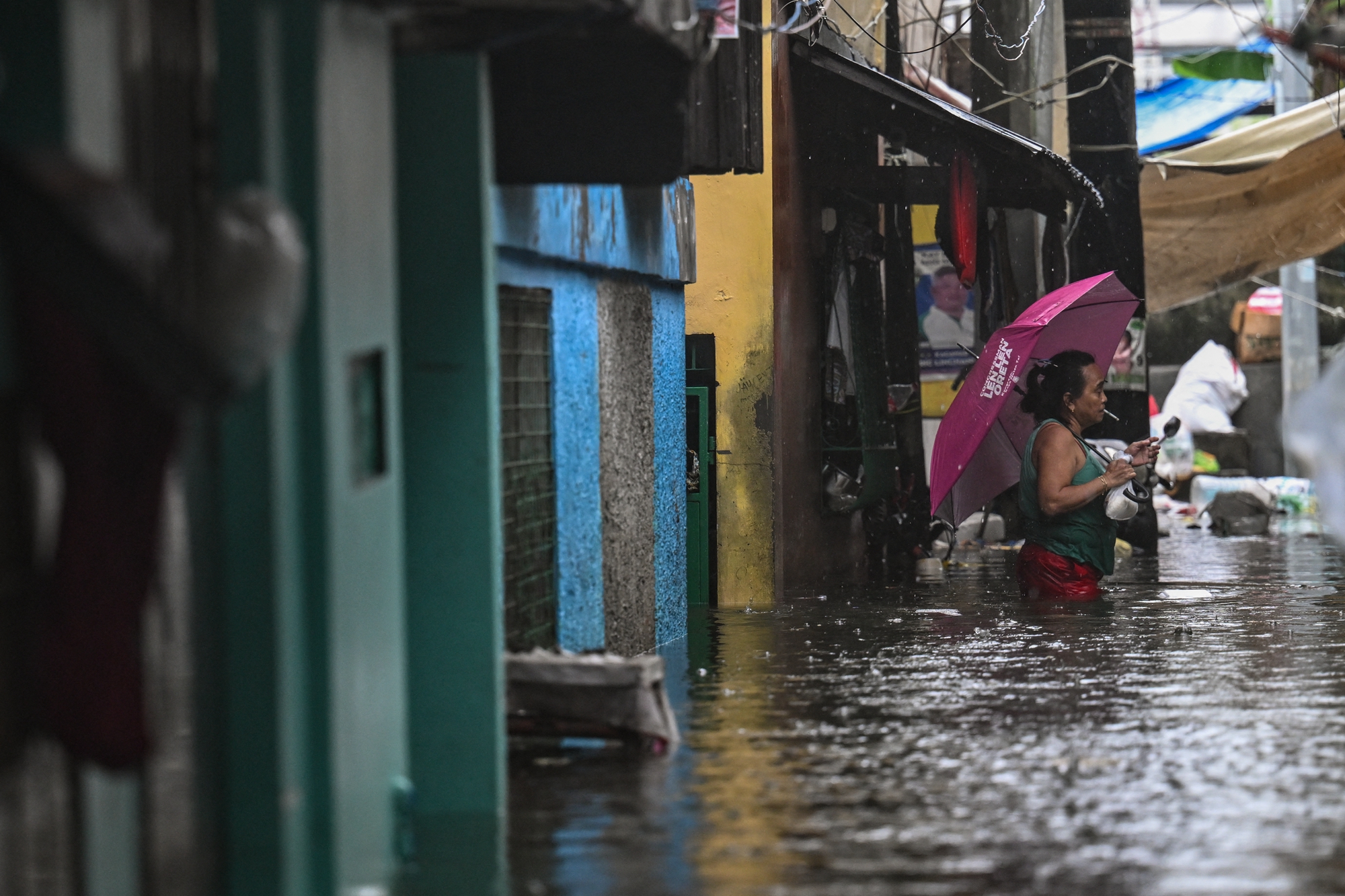 2025年7月24日,馬尼拉北部邦班詩蘭省(Pangasinan,又譯邦阿西楠省)達古潘市(Dagupan City)遭暴雨襲擊後,民眾涉水穿過被洪水淹沒的街道。(STR/AFP via Getty Images)
