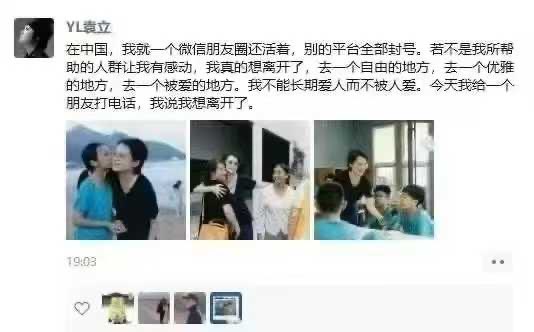 隨後,袁立在另一則帖文中透露,「若不是我所幫助的人群讓我有感動,我真的想離開了,去一個自由的地方,去一個優雅的地方,去一個被愛的地方。我不能長期愛人而不被人愛。」
