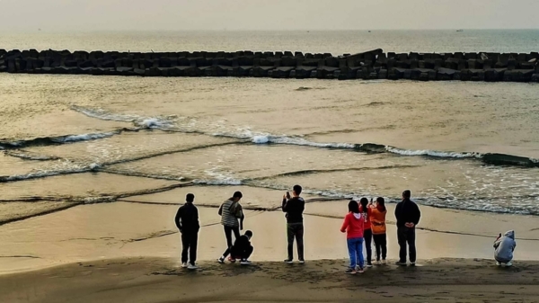 此外,他分享要看離岸堤「方塊海」,需要潮差大和天氣配合。他曾在汕尾海域當風大又退潮時看到「方塊海」,還親眼見到有漁夫在釣魚。他還拍攝到外地來的幾位遊客,很幸運親眼看見「方塊海」的畫面。此外,他還在大約距離「方塊海」一公里的聖母宮前海域,發現「方塊浪」。
