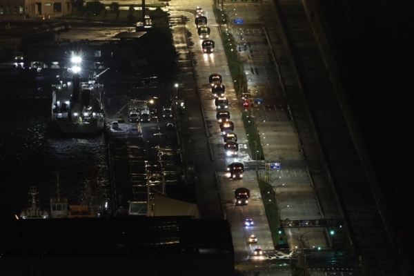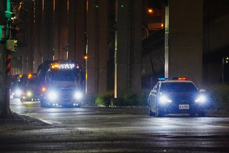 第2批M1A2T戰車27日晚間運抵台北港,裝載的卡車28日凌晨離開港區大門,由警車前導。(中央社)