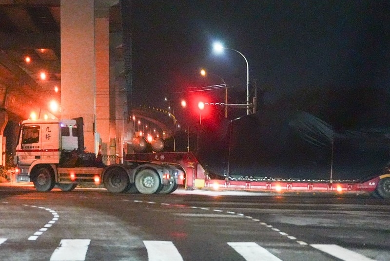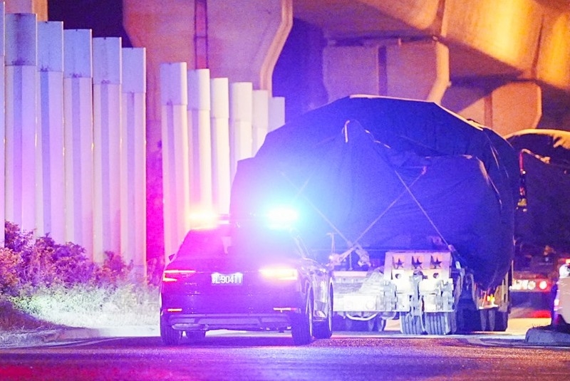 圖為裝載M1A2T的卡車2025年7月28日凌晨自港口發車。(中央社)