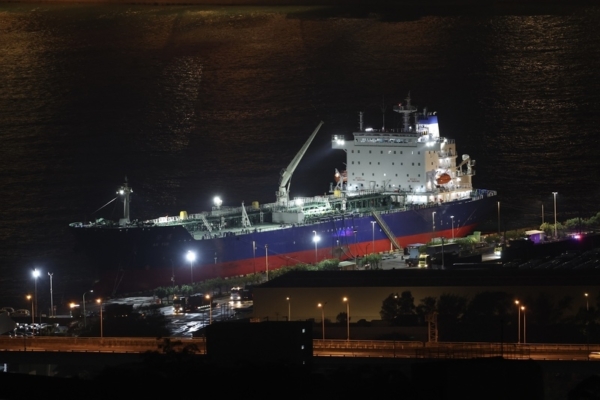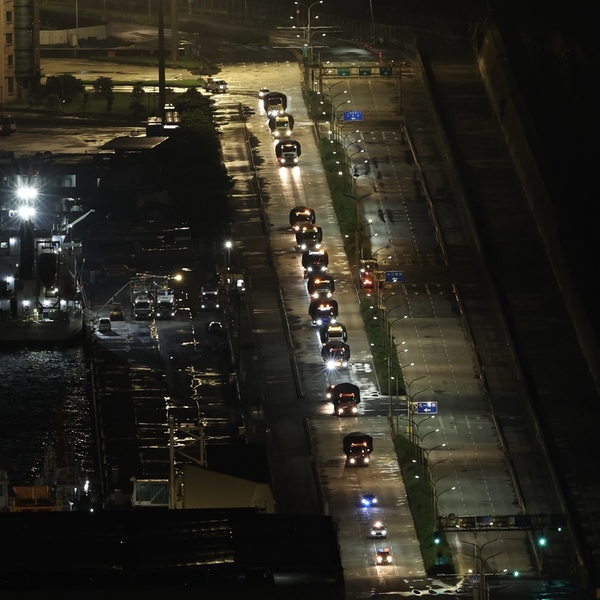 台灣向美國採購的第2批42輛M1A2T戰車運抵台北港後,循2024年模式板運至新竹裝訓部。圖為裝載M1A2T的卡車2025年7月28日凌晨沿港區道路駛離港口。(中央社)