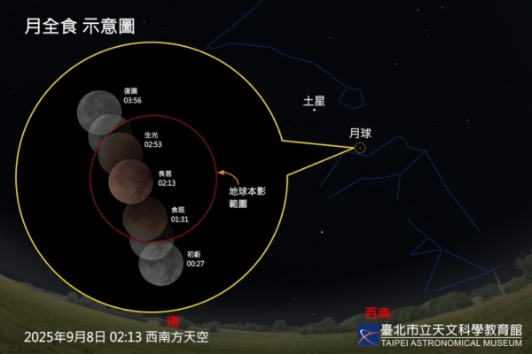 【大紀元2025年08月30日訊】(大紀元記者鍾元台灣報導)台北市立天文科學教育館(天文館)表示,9月有月全食、土星衝,還有星團與星月共舞等重量級天象登場。