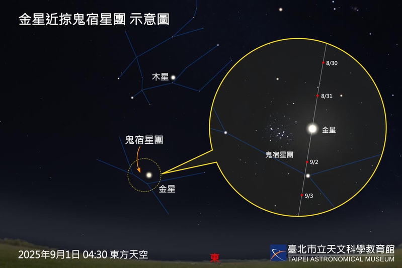 除了月全食,9月1日凌晨3時許,金星與鬼宿星團將一同由東北方升起,兩者相距僅約1度。亮度高達-3.9等的金星,在由數十顆小星簇集而成的鬼宿星團旁格外耀眼,非常適合以雙筒望遠鏡觀賞。