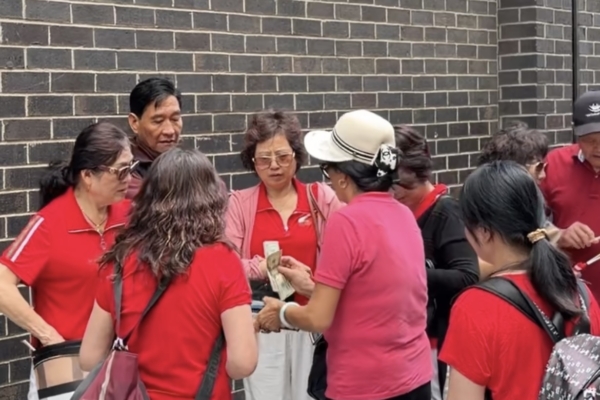 只見這些福建人統一穿著紅衣服,有的人拿著中共血旗,好幾個人手上拿著錢。有一個女的手上拿著一疊鈔票,在分發給其他人;有另一個女的從包裡拿出更多的鈔票,另一個人伸著手準備接過來;拿到錢的人,趕緊把錢放到包裡。還有人用福州話說給了多少多少錢,待會去喝茶。