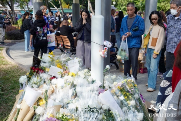 【大紀元2025年11月30日訊】(大紀元香港記者站報導)香港大埔宏福苑5級大火至少奪走128人生命,仍有超過200人失蹤。在大火發生後的第3天(11月29日週六),7幢大廈的火勢已撲滅。大批市民手持白花前往火災現場附近悼念,並跟進物資援助。