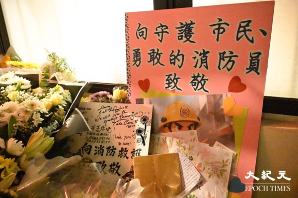 圖為多名市民在消防局外悼念,留下鮮花和心意卡。香港大埔宏福苑5級大火奪走逾百人生命,至今仍有超過200人失蹤。2025年11月29日,市民到火災現場附近悼念。(吳銳略/大紀元)