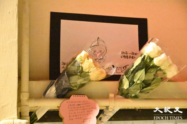 在宏福苑對面的廣福休憩處,大批市民前來獻花悼念,其中一個燈柱下放滿花和悼念的卡片,有卡片寫著「天佑(祐)大埔、天佑(祐)香港、逝者安息、生者堅強」。