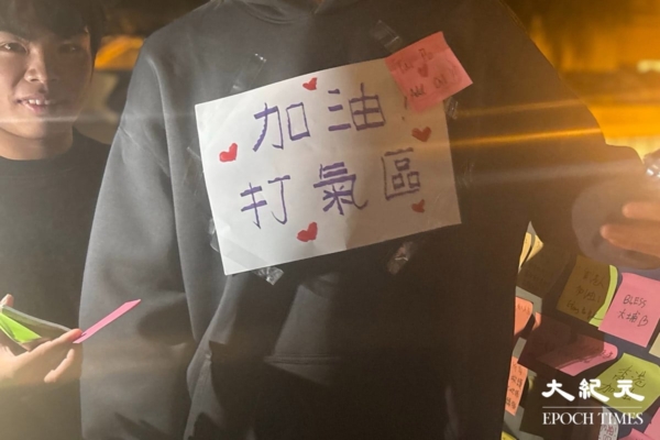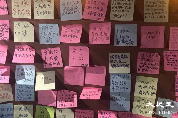 圖為有市民自發在廣福邨平台設立打氣牆,路過的居民留下心聲,以抒發情緒。香港大埔宏福苑5級大火奪走逾百人生命,至今仍有超過200人失蹤。(日谷/大紀元)