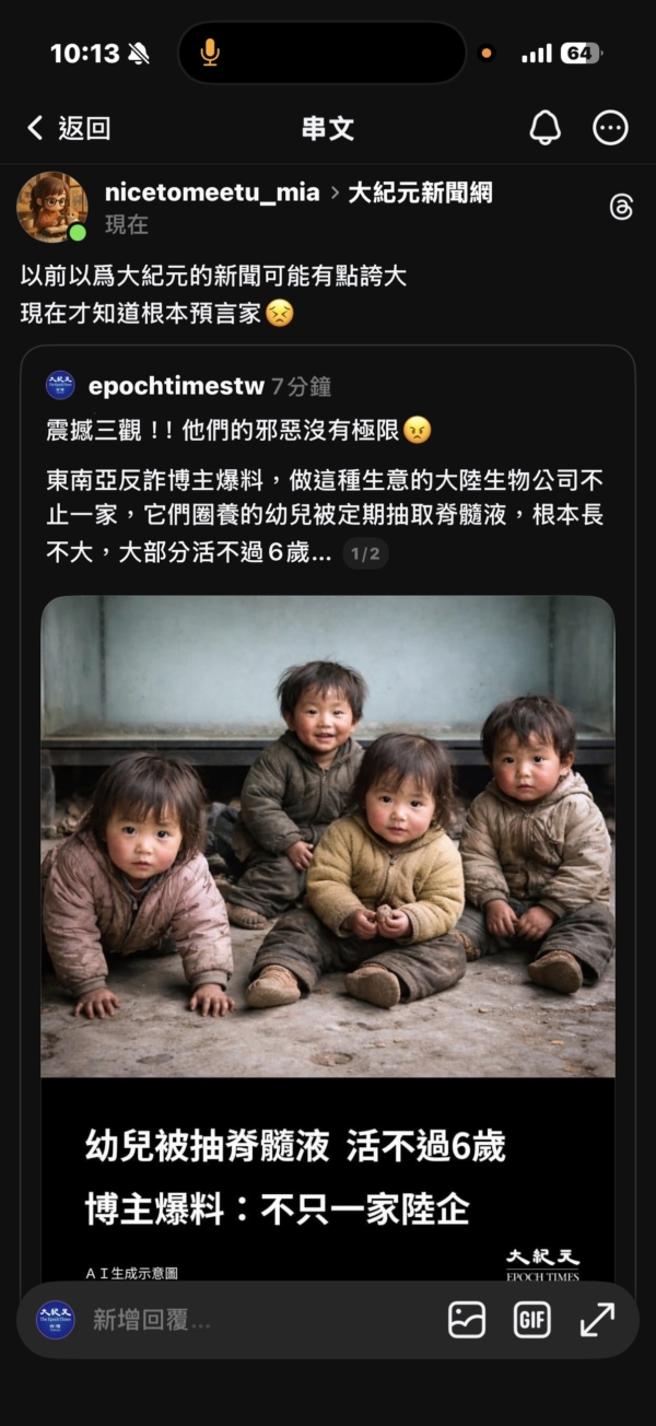 「《大紀元時報》-台灣」Threads官方帳號小編陳語馨說,Threads有近350萬台灣用戶,多數是年輕世代,而中共也把Threads當成滲透重點,派出大量中共網軍,目的是強化中共論述,以迷惑台灣的年輕人。