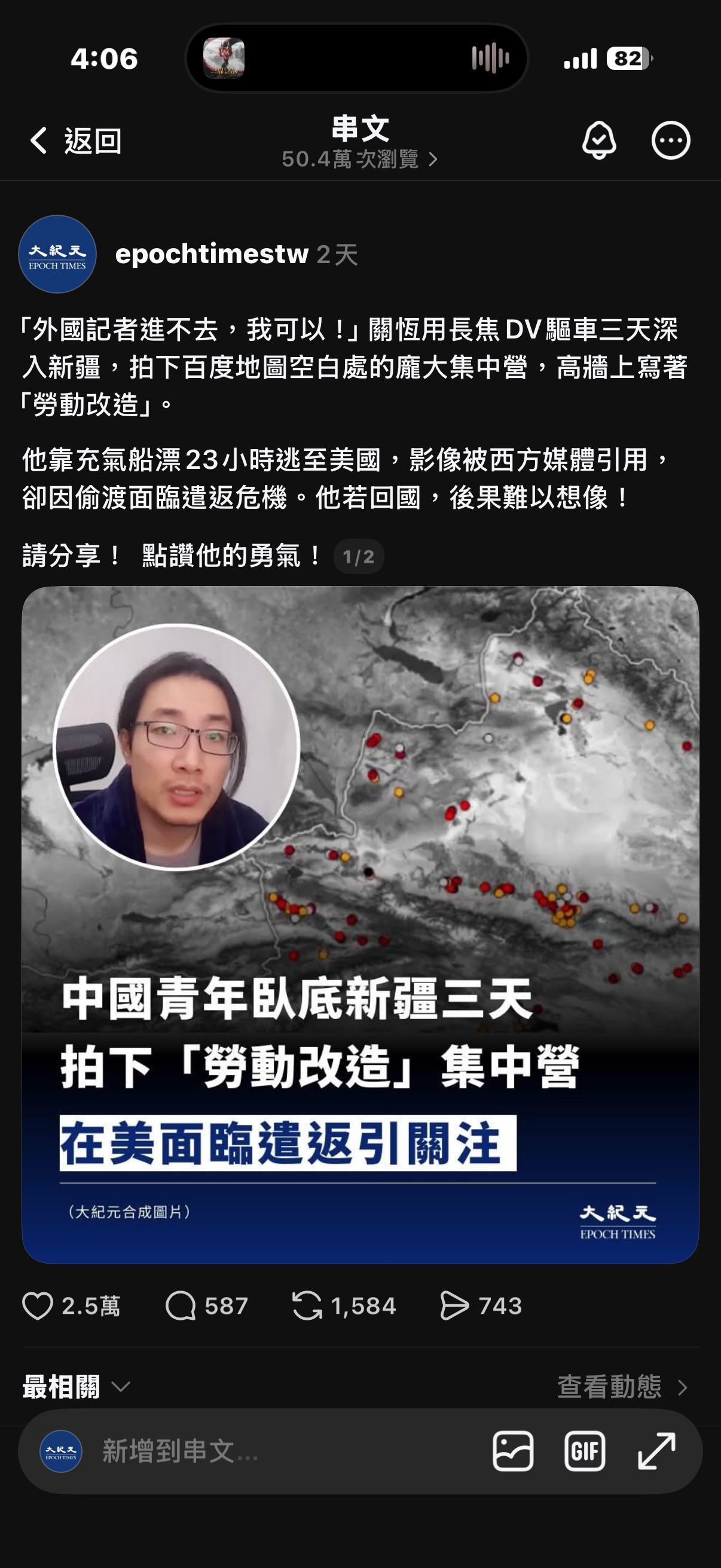 2週創200萬瀏覽 台灣大紀元Threads帳號卻遭下架