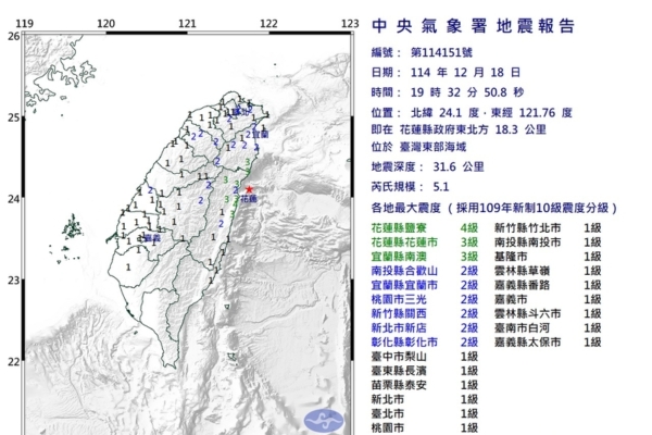 【大紀元2025年12月18日訊】(大紀元記者鍾元台灣報導)台灣中央氣象署表示,今天(18日)晚間7時32分左右花蓮地區發生芮氏規模5.1有感地震,震央位置在花蓮縣政府東北方18.3公里(位於台灣東部海域),震源深度31.6公里。